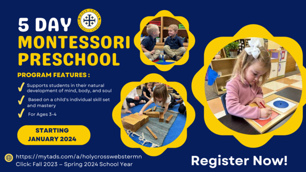 Holy Cross is excited to offer Montessori-style preschool for ages 3-4. We currently offer a 3-day program (Tuesday-Thursday), but starting January 2024, we will be offering a 5-day program as well.